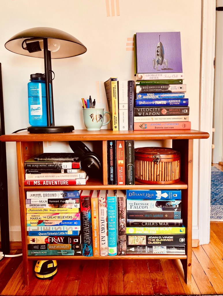 My nightstand holds most of my shame, although there are other tbr pockets around the house…and of course the kindle.